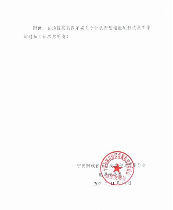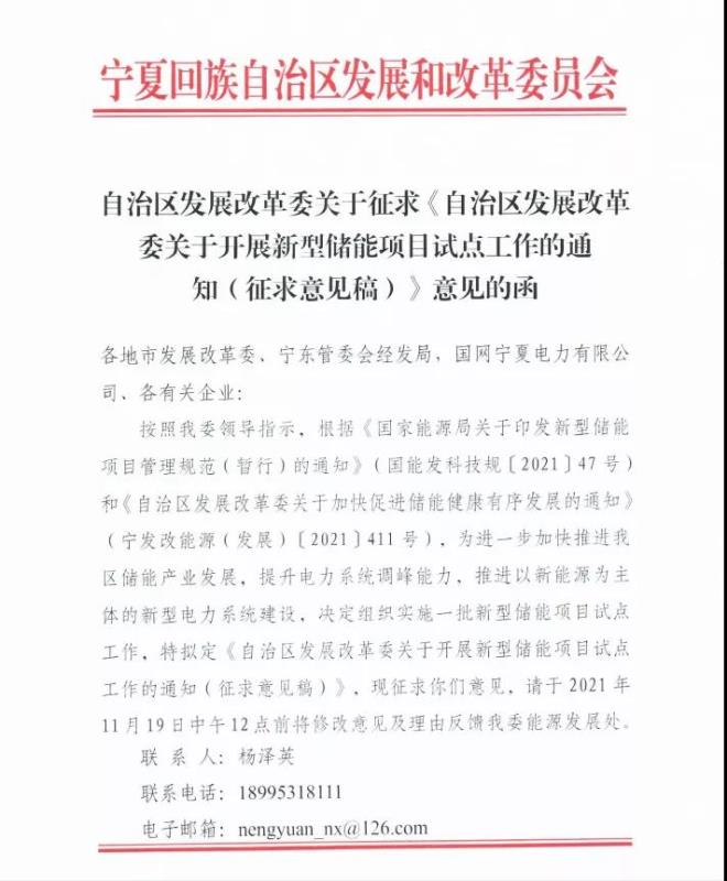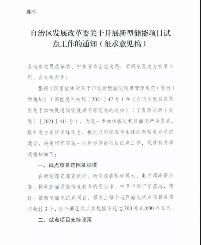 中國儲能網(wǎng)訊:11月17日,寧夏回族自治區(qū)發(fā)展和改革委員會發(fā)布關(guān)于開展新型儲能項(xiàng)目試點(diǎn)工作的通知(征求意見稿),根據(jù)意見稿,在新能源資源稟賦好、新能源裝機(jī)規(guī)模大、電網(wǎng)調(diào)峰需求高、輸電斷面受限情況較多的吳忠市、中衛(wèi)市及寧東基地,建設(shè)一批新型儲能試點(diǎn)項(xiàng)目,原則上每個(gè)地區(qū)儲能試點(diǎn)項(xiàng)目數(shù)量不超過3個(gè),每個(gè)地區(qū)項(xiàng)目總規(guī)模不超過300兆瓦/600兆瓦時(shí)。
