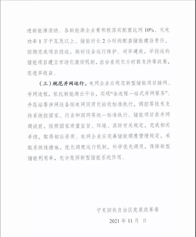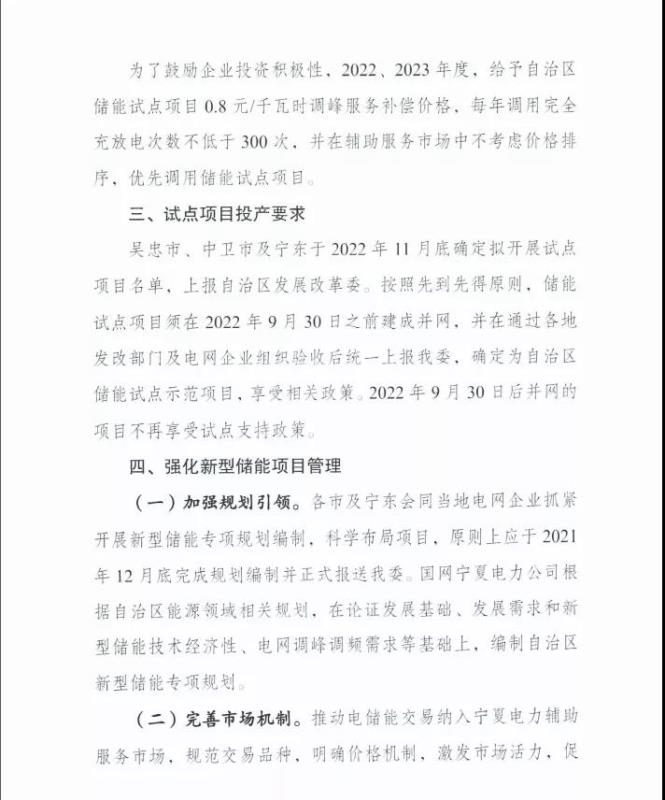 試點(diǎn)項(xiàng)目投產(chǎn)要求:吳忠市、中衛(wèi)市及寧東于2022年11月底確定擬開展試點(diǎn)項(xiàng)目名單,上報(bào)自治區(qū)發(fā)展改革委。按照先到先得原則,儲能試點(diǎn)項(xiàng)目須在2022年9月30日之前建成并網(wǎng),并在通過各地發(fā)改部門及電網(wǎng)企業(yè)組織驗(yàn)收后同意上報(bào)我委,確定為自治區(qū)儲能試點(diǎn)示范項(xiàng)目,享受相關(guān)政策。2022年9月30日后并網(wǎng)的項(xiàng)目不再享受試點(diǎn)支持政策。
