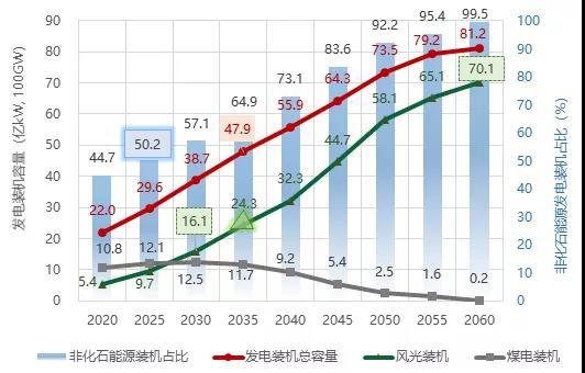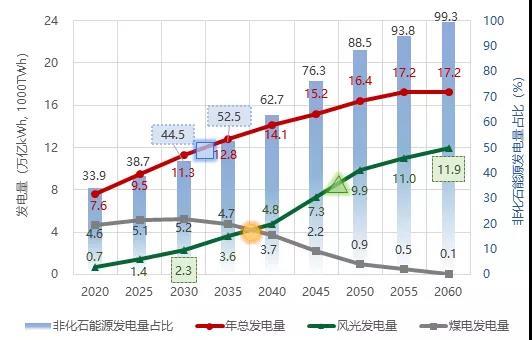 發(fā)電量方面,2030-2035年間非化石能源年發(fā)電量超過(guò)50%,形成非化石能源發(fā)電為主體的電力系統(tǒng);風(fēng)光發(fā)電量快速提升是非化石能源發(fā)電量占比提高的主要原因,2030年風(fēng)光發(fā)電量達(dá)到2.3萬(wàn)億千瓦時(shí),占總發(fā)電量20%;2035-2040年間風(fēng)光發(fā)電量開始超過(guò)煤電,之后煤電進(jìn)一步加速退役,風(fēng)光發(fā)電量在總發(fā)電量中占比加速提高,2045-2050年間超過(guò)50%,成為發(fā)電主體;2060年風(fēng)光發(fā)電量11.9萬(wàn)億千瓦時(shí),占總發(fā)電量69.2%,為構(gòu)建以新能源為主體的新型電力系統(tǒng)創(chuàng)造必要條件。