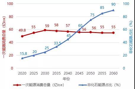 圖1 2020-2060年我國(guó)一次能源消費(fèi)總量及非化石能源占比
