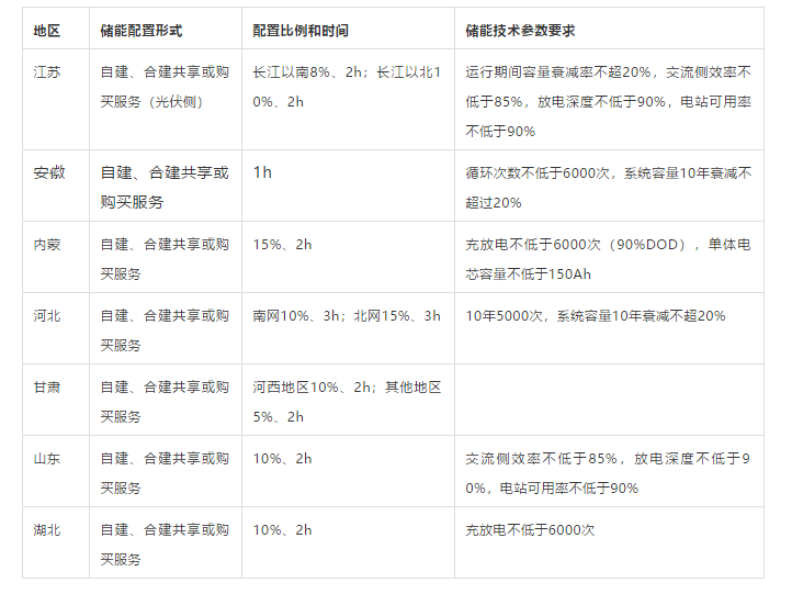 今年以來,各地關(guān)于風(fēng)電、光伏發(fā)電開發(fā)建設(shè)項(xiàng)目配置儲(chǔ)能的方式進(jìn)行了差異化和細(xì)致化的規(guī)定,編者對(duì)部分地區(qū)配置儲(chǔ)能相關(guān)文件的梳理,詳見下表。