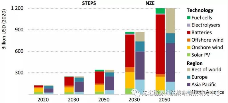 圖1 2020-2050年按技術類別和地區(qū)劃分的清潔能源技術市場規(guī)模(單位:十億美元)