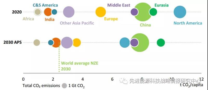 當前全球還有數億人無法獲得最基本的現代能源。除中國之外的新興市場和發(fā)展中經濟體占當今全球人口的三分之二,到2050年將占世界人口增量(20億)的絕大部分,新興市場和發(fā)展中經濟體對全球能源發(fā)展趨勢將起重要作用。關鍵清潔能源技術成本下降為新興市場和發(fā)展中經濟體發(fā)展低碳能源提供了重要機會,但還未表現出終端用能部門跨越式采用低碳技術的趨勢。在既定政策情景下,到2030年新興市場和發(fā)展中經濟體石油需求較2020年將增加1200萬桶/天(增長近30%),天然氣需求將增加5200億立方米(增長近25%),煤炭需求將增加1.6億噸(增長4%);而發(fā)達國家對化石燃料的需求將下降。中國目前在可再生能源基礎設施建設方面處于全球領先地位,越來越多的新興市場和發(fā)展中經濟體也相繼進行了部署示范。既定政策情景中,到2030年可再生能源占新興市場和發(fā)展中經濟體(不包括中國)新增電力裝機容量的三分之二,而目前這一比例約為50%。在既定政策情景下,新興市場和發(fā)展中經濟體的電力需求將快速增長,這主要是由于工業(yè)部門電機和電器擁有量的增加。綜上所述,新興市場和發(fā)展中經濟體將對未來幾十年內CO2排放量的增長至關重要。在既定政策情景下,到2050年新興市場和發(fā)展中經濟體(不包括中國)的碳排放量將增加55億噸,其中工業(yè)和交通部門碳排放量增幅最大;相比之下,發(fā)達經濟體碳排放量將減少37億噸,中國將減少30億噸。在承諾目標情景下,碳排放量差別更為顯著。盡管新興市場和發(fā)展中經濟體中只有小部分國家承諾凈零排放,但應注意到該地區(qū)(不包括中國)的人均碳排放遠低于發(fā)達國家,承諾目標情景中到2030年其人均排放量不到發(fā)達經濟體平均水平的一半。