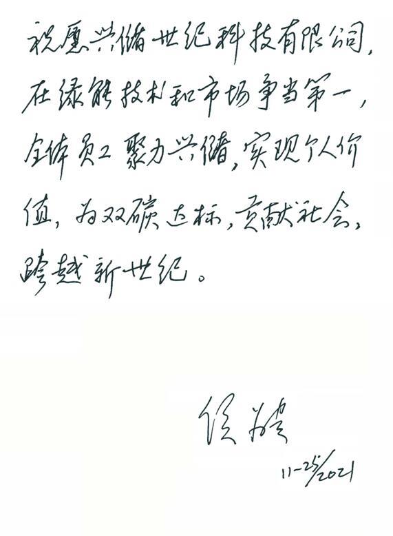 “祝愿興儲(chǔ)世紀(jì)科技有限公司,在綠能技術(shù)和市場(chǎng)爭(zhēng)當(dāng)?shù)谝唬w員工聚力興儲(chǔ),實(shí)現(xiàn)個(gè)人價(jià)值,為雙碳達(dá)標(biāo),貢獻(xiàn)社會(huì),跨越新世紀(jì)。”