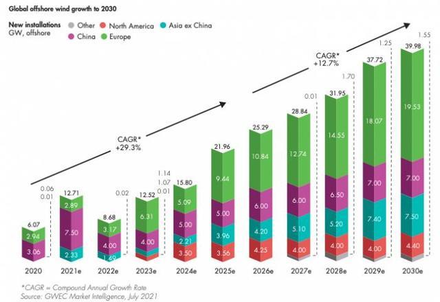 全球風(fēng)能理事會(huì)(GWEC)在其發(fā)布的《2021年全球海上風(fēng)電報(bào)告》中指出,在未來(lái)十年內(nèi),伴隨著全球能源脫碳趨勢(shì)的加速,加之海上風(fēng)電度電成本急劇下降、漂浮式風(fēng)電的商業(yè)化和工業(yè)化繼續(xù)取得進(jìn)展等因素,海上風(fēng)電還將繼續(xù)維持快速增長(zhǎng)。