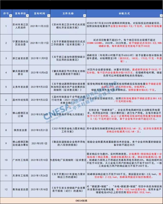 9月溫州發(fā)布《溫州市制造業(yè)千企節(jié)能改造行動方案(2021-2023)(征求意見稿)》,針對用戶側(cè)儲能按照實際放電量給予儲能運營主體0.8元/千瓦時的補貼。同期義烏市發(fā)布《關(guān)于推動源網(wǎng)荷儲協(xié)調(diào)發(fā)展和加快區(qū)域光伏產(chǎn)業(yè)發(fā)展的實施細則(征求意見稿)》,提出對接受電網(wǎng)統(tǒng)調(diào)的儲能系統(tǒng)按照峰段實際放電量給予儲能運營主體0.25元/千瓦時補貼,補貼兩年。同時,儲能電站可以將容量置換給光伏電站或置換給企業(yè)作為可中斷負荷資源(同一電站的容量資源,不可同時與多個主體進行置換),此外儲能系統(tǒng)優(yōu)先參與需求響應(yīng),按照儲能系統(tǒng)容量每年給予儲能運營主體 6 元/千瓦的補貼,按照響應(yīng)期間實際放電量給予儲能運營主體 4 元/千瓦時的補貼。