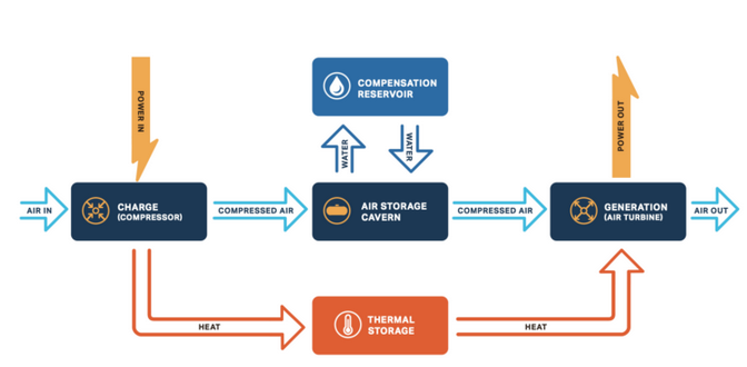 Hydrostor公司開發(fā)的A-CAES儲能系統(tǒng)的工作原理是,使用電力壓縮空氣,然后將壓縮空氣儲存在一個大型地下洞穴中。當需要電力時,該儲能系統(tǒng)通過釋放壓縮空氣通過渦輪機發(fā)電。