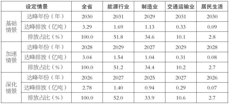 ◆在基礎(chǔ)情景下,全省與全國(guó)同步達(dá)峰,但能源行業(yè)、交通運(yùn)輸業(yè)要比全國(guó)晚1年達(dá)峰,制造業(yè)早1年達(dá)峰;
