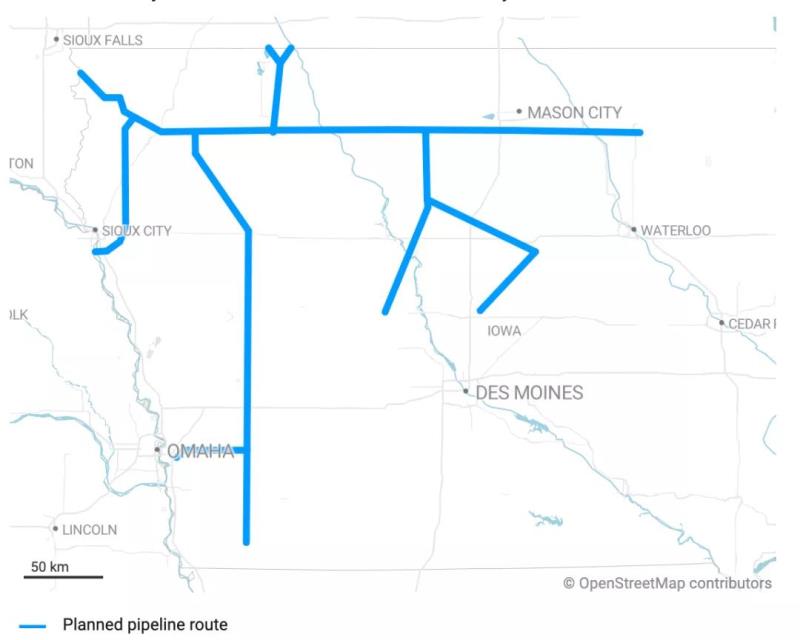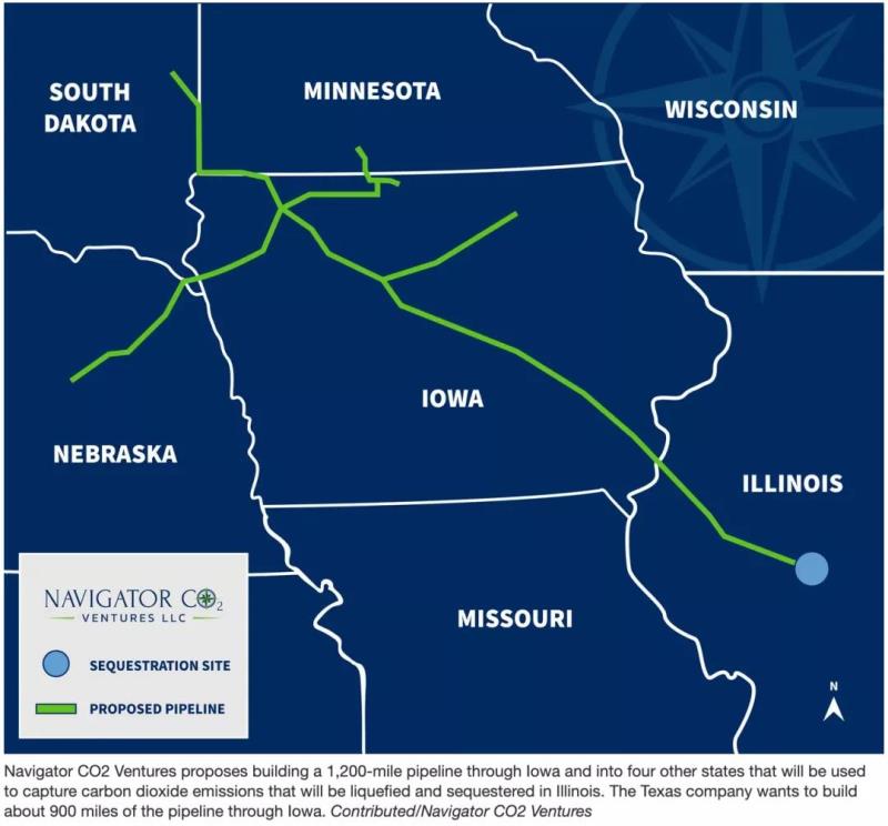 總部位于德克薩斯州的Navigator CO2公司稱其項(xiàng)目為Heartland Greenway System(“腹地綠道系統(tǒng)”),計劃在愛荷華州的36個縣修建約900英里的管道,并延伸到伊利諾斯州、內(nèi)布拉斯加州、明尼蘇達(dá)州和南達(dá)科他州,管道總長度1300英里。Summit公司表示將從31家生物燃料工廠捕集和封存碳;Navigator已與20家乙醇和化肥廠達(dá)成碳捕集和封存協(xié)議。