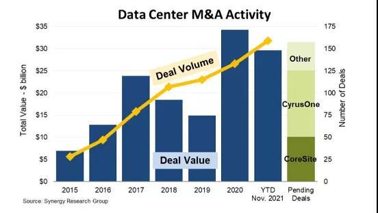 據Synergy研究統(tǒng)計,截至2021年11月中旬,今年已完成的數(shù)據中心并購交易總數(shù)已遠遠超過去年的創(chuàng)紀錄數(shù)量。雖然今年迄今為止完成的交易總價值尚未達到2020年的水平,但如果CoreSite的收購在年底前正式完成,2021年的交易價值至少比去年高出16%。而且由于還有幾項交易已達成一致但正在等待正式結束,因此2021年的最終數(shù)字可能會更高。