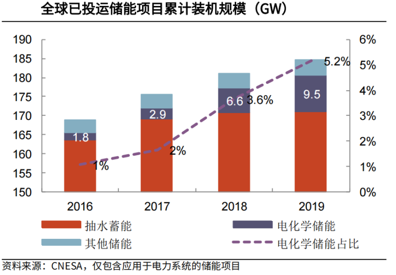 截至2020年底的數(shù)據(jù)顯示,全球已投運儲能項目累計裝機(jī)規(guī)模 191.1GW。其中,抽水蓄能的累計裝機(jī)規(guī)模為 172.5GW,電化學(xué)儲能為14.2GW。電化學(xué)儲能占比相較此前有所擴(kuò)大,但占整體比重仍沒有超過10%。