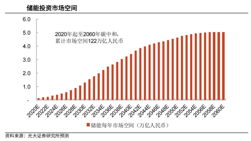 《每日經(jīng)濟(jì)新聞》記者注意到,目前市場普遍對儲能發(fā)展的前景相當(dāng)看好。光大證券測算稱,2030年儲能需求空間可達(dá)到1.25Twh(億千瓦時),2020年-2030年累計3.9TWh.2030年儲能市場空間有望達(dá)到1.3萬億元,到2060年有望達(dá)到5萬億元。