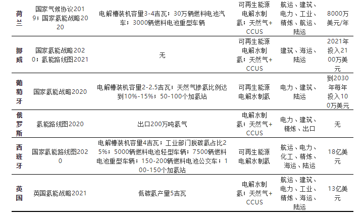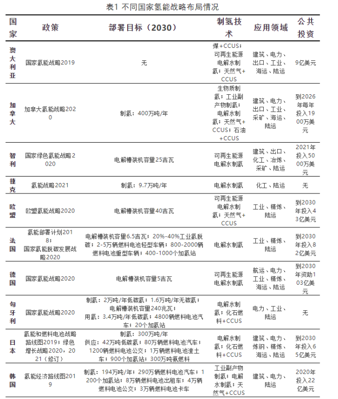 迄今公布的氫能戰(zhàn)略顯示,幾乎所有國家對氫能在其能源系統(tǒng)中所扮演角色的認(rèn)識大致相同,都強(qiáng)調(diào)了其對交通運(yùn)輸和工業(yè)部門脫碳的重要性。具體國家氫能戰(zhàn)略布局如表1所示: