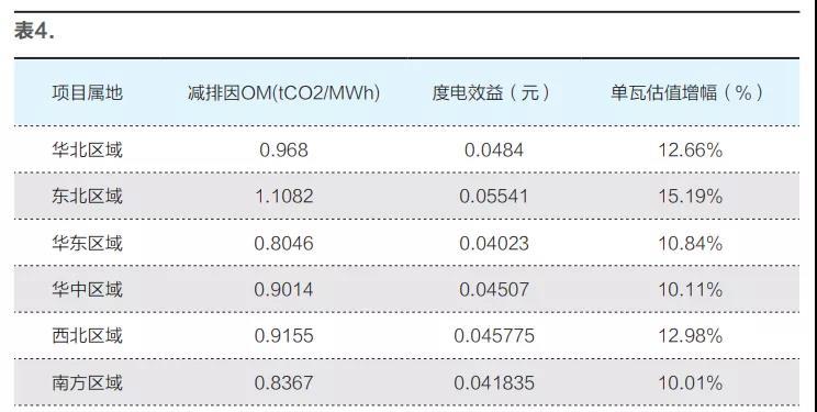 以現(xiàn)期碳交易價(jià)格50元每噸條件下測算,對碳減排度電效益折算到度電效益,并由其度電效益的增加測算其估值增幅,具體測算結(jié)果如表4:
