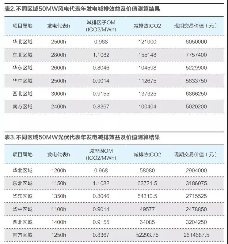 以電場發(fā)電量為基數(shù),取電量邊際排放因子的加權(quán)平均值0M計(jì)算,以下是不同區(qū)域50MW的風(fēng)電項(xiàng)目的代表年份發(fā)電情況的減排效益測算,按照目前市場價(jià)碳排放配額合計(jì)每噸約為50元。