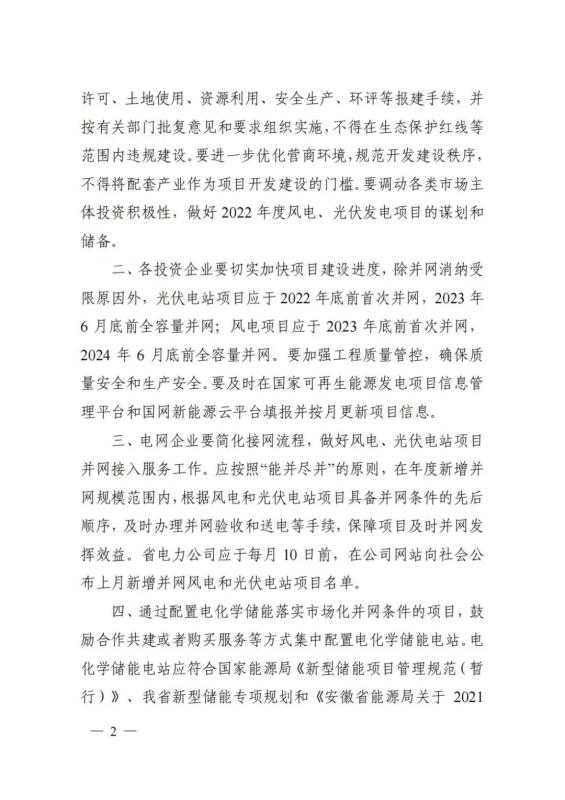 此外,文件要求各投資企業(yè)要切實(shí)加快項(xiàng)目建設(shè)進(jìn)度,除并網(wǎng)消納受限原因外,光伏電站項(xiàng)目應(yīng)于2022年底前首次并網(wǎng),2023年6月底前全容量并網(wǎng);風(fēng)電項(xiàng)目應(yīng)于2023年底前首次并網(wǎng),2024年6月底前全容量并網(wǎng)。