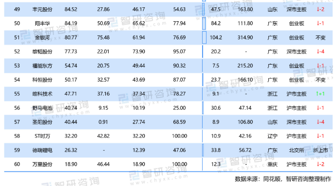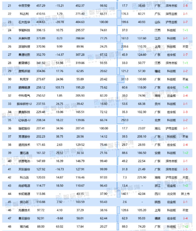 從所屬省份看,60家企業(yè)分布在17個(gè)省份,總部位于廣東的企業(yè)最多,有25家,占比高達(dá)41.67%,其中有億緯鋰能、天賜材料、欣旺達(dá)、貝特瑞4家企業(yè)總市值排名進(jìn)入前10強(qiáng),7家企業(yè)坐落于浙江,其中總市值最高的是排名第12的杉杉股份;從上市板塊來看,21家企業(yè)在滬深主板上市,20家企業(yè)在創(chuàng)業(yè)板上市,16家企業(yè)在科創(chuàng)板上市,以及上月3家企業(yè)在北交所上市。