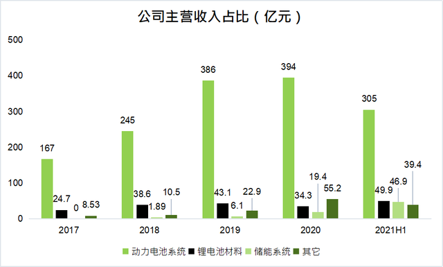 從公司主營收入來看,儲能系統(tǒng)的收入也正逐年上升,2021年上半年儲能系統(tǒng)收入46.93億元,同比增長727.36%,占營收比重10.65%,毛利率維持在36.60%的高位,迅速發(fā)展為公司第二大驅動力量。