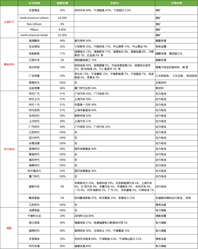 寧德時代脫胎于ATL,在鋰電池材料領域布局較早;同時自2011年公司成立,便開始布局儲能領域;2012年起開始布局新能源汽車動力電池;2018年起開始布局上游礦產(chǎn)。公司主要是通過合資參股或者成立全資子公司的方式參與到以動力電池為核心的上下中游,作全產(chǎn)業(yè)鏈布局。