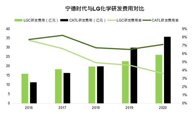 在2018年之后,寧德時代的研發(fā)投入趕超LG化學,研發(fā)費用率一直穩(wěn)居高位。目前不管是專利還是研發(fā)投入,寧德時代都領先于同行。