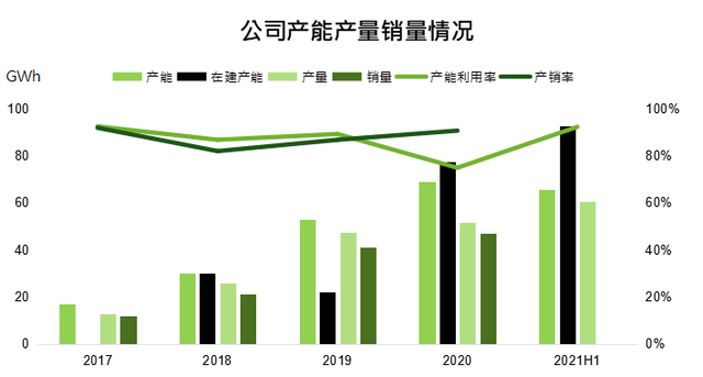 從產(chǎn)能來看:2021年上半年寧德時代動力電池產(chǎn)能65.45GWh,在建產(chǎn)能92.50GWh,產(chǎn)量為60.34GWh,已超2020全年51.71GWh的產(chǎn)量,產(chǎn)能利用率也從2020年的74.83%升至92.20%。最近幾年公司產(chǎn)能、在建產(chǎn)能、銷量都保持穩(wěn)定增長。