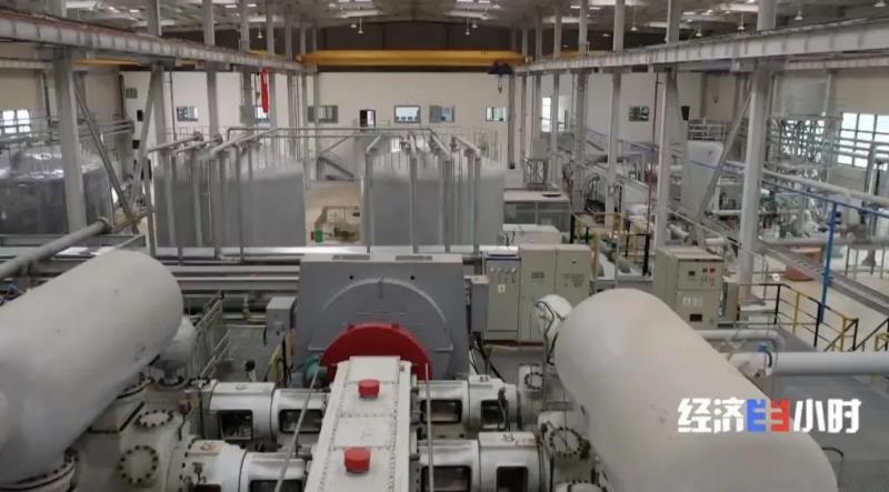 這個占地兩萬多平方米的超大空間就是儲能系統(tǒng)的車間。這里密布著管道和容器,乍一看感覺就像進入了化工廠。不過這里的工作人員告訴記者,系統(tǒng)的工作過程只是一個純粹的物理過程,沒有化學反應,因此也就沒有需要排棄的廢物。