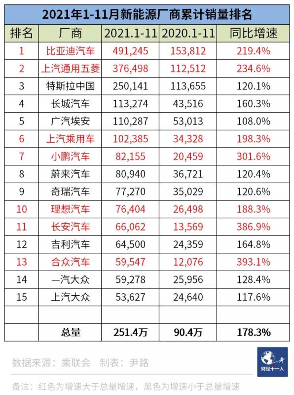 中國(guó)儲(chǔ)能網(wǎng)訊:2021年1月-11月,根據(jù)乘聯(lián)會(huì)數(shù)據(jù),新能源車(chē)批發(fā)銷(xiāo)量達(dá)280.7萬(wàn)輛,同比增長(zhǎng)190.7%,全年破300萬(wàn)已成定局。