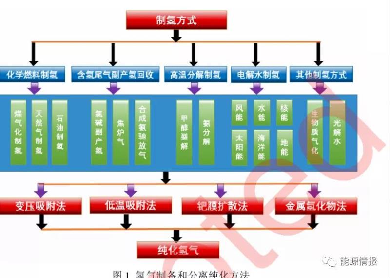 現(xiàn)在有多種制氫的方法,大體可以分成化學原料制氫、含氫尾氣副產氫回收、高溫分解制氫、電解水制氫、其他方法制氫等5大類,并經過變壓吸附、低溫吸附、鈀膜擴散法、金屬氫化物等方法分離提純獲得所需要純度的氫氣,如圖1所示。