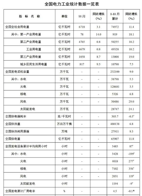 1-11月份,全國(guó)發(fā)電設(shè)備累計(jì)平均利用3483小時(shí),比上年同期增加87小時(shí)。其中,核電7102小時(shí),比上年同期增加356小時(shí);風(fēng)電2031小時(shí),比上年同期增加119小時(shí)。