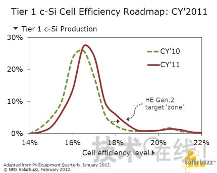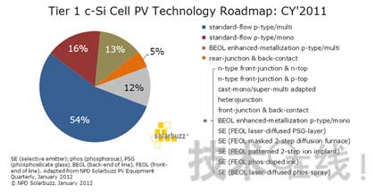 圖1 一線(xiàn)晶硅電池廠商2011年光伏技術(shù)路線(xiàn)圖(來(lái)源:NPD Solarbuzz)