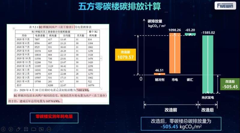 依據(jù)《建筑碳排放計(jì)算標(biāo)準(zhǔn)》GB/T 51366-2019,對(duì)建筑電力、氫氟碳化物、碳匯等帶來(lái)的碳排放量進(jìn)行計(jì)算,五方零碳樓(50年)運(yùn)行碳排放量為-505 kgCO2/m2,能夠?qū)崿F(xiàn)建筑零碳運(yùn)行。