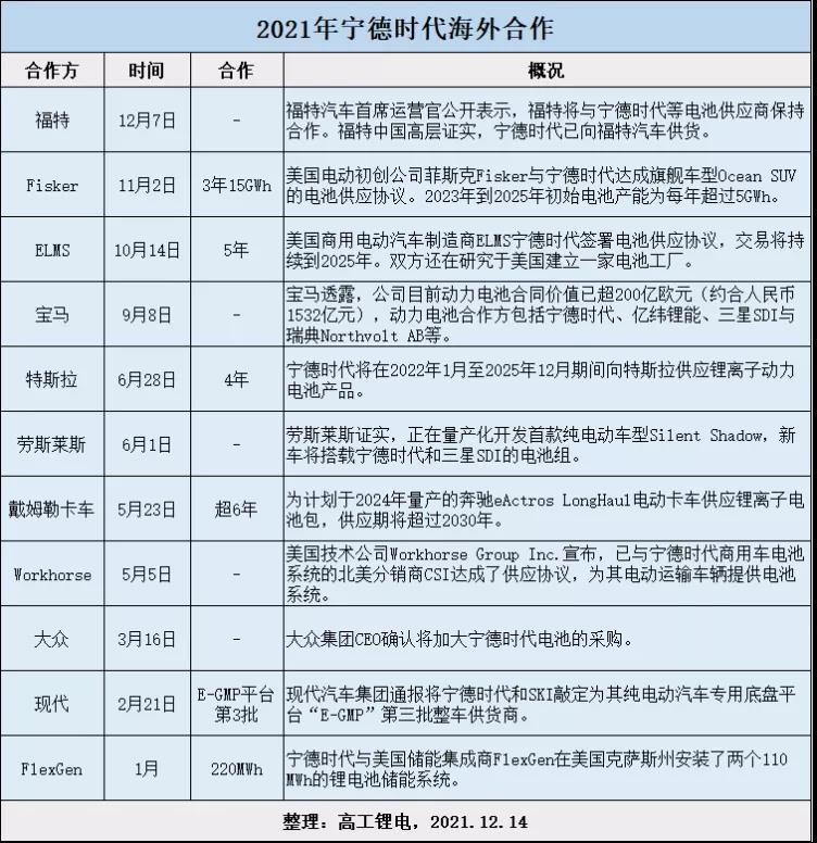 高工鋰電統(tǒng)計,今年以來,寧德時代已與現(xiàn)代、大眾、戴姆勒卡車、勞斯萊斯、特斯拉、寶馬、菲斯克等國際車企傳出合作及加大合作的消息。