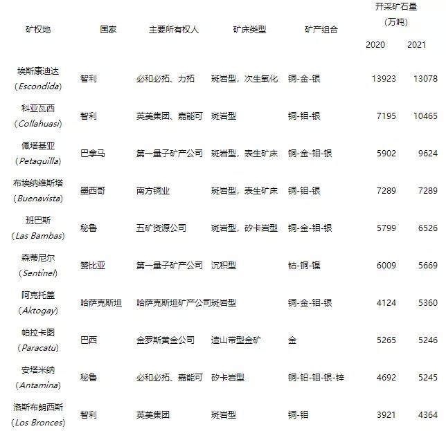 名列第一的是位于世界最大銅生產(chǎn)國(guó)智利的埃斯康迪達(dá)(Escondida)銅礦山。該礦由必和必拓公司(占57.5%股份)經(jīng)營(yíng),每天可開采礦石36萬噸。根據(jù)前三季度產(chǎn)量,估計(jì)埃斯康迪達(dá)銅礦2021年可開采銅銀金礦石13078萬噸。世界第二大礦業(yè)企業(yè)力拓公司持有該礦30%股份。