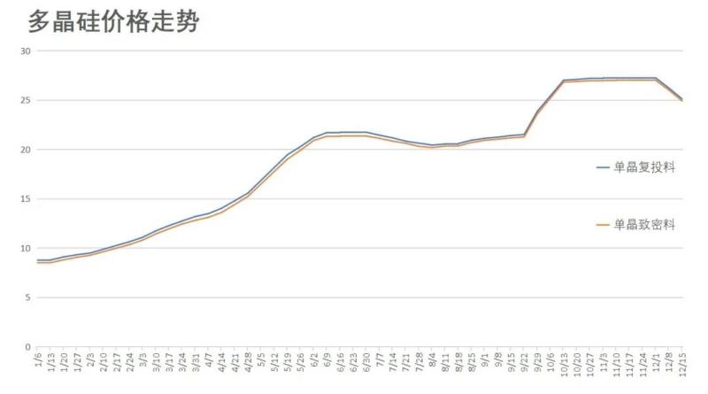 8月中旬,硅料開啟了第二階段的漲價潮。此后,經(jīng)歷了連續(xù)十二周的連漲,單晶復(fù)投料和單晶致密料分別從20.53萬元/噸和20.32萬元/噸升至27.22萬元/噸26.99萬元/噸的峰谷,且超過一個月保持在該高位不見松動。