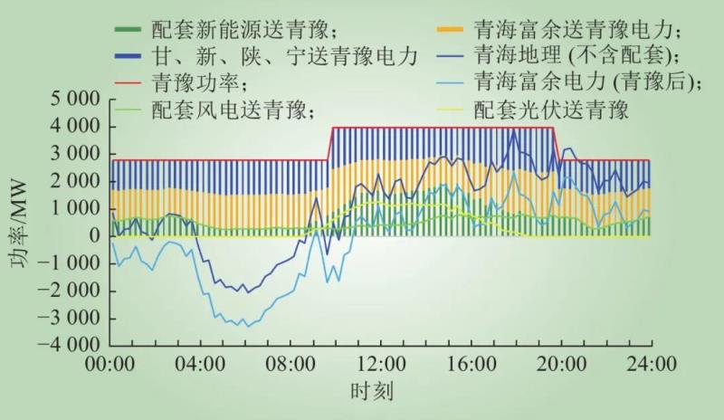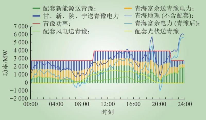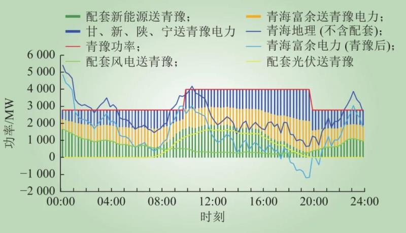 注:圖中各量均為有功電力,其中:設(shè)置新能源小發(fā)月份的配套風(fēng)電、配套光伏曲線;根據(jù)青豫直流打捆方式原則,設(shè)置青海地理(不含配套)曲線=青海火電出力+青海水電出力+青海風(fēng)電出力+青海光伏出力?青海負(fù)荷出力?配套風(fēng)電出力?配套光伏出力;設(shè)置青豫直流外送曲線=配套新能源送青豫電力+青海富余送青豫電力+甘、新、陜、寧送青豫電力;配套新能源送青豫=配套風(fēng)電送青豫+配套光伏送青豫,配套新能源全部通過青豫直流外送;青海富余送青豫電力為青海電網(wǎng)內(nèi)配套風(fēng)電和配套光伏之外的通過青豫直流外送的清潔能源;為了測算打捆交易靈活互濟(jì)電力,設(shè)置青海富余電力(青豫后)=青海地理(不含配套)?青海富余送青豫電力。