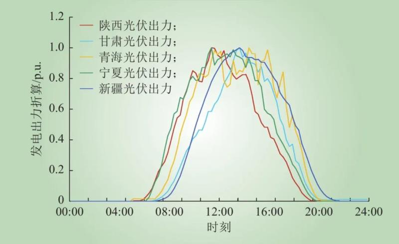 西北電網(wǎng)東西跨度3000 km,在新能源方面,分布有酒泉風(fēng)電光伏基地、達(dá)坂城風(fēng)電光伏基地、青海海西海南風(fēng)電光伏基地;在水電方面,覆蓋黃河流域、漢江流域、白龍江流域;風(fēng)電、光伏、水電在時(shí)空特性上存在一定的互補(bǔ)特性和接續(xù)特性。以光伏為例,西北電網(wǎng)隨著緯度從東向西變化,光伏發(fā)電呈現(xiàn)一定的接續(xù)性,如圖11典型日光伏出力曲線所示,陜西光伏出力極值時(shí)刻為11:30,寧夏光伏出力的極值時(shí)刻為12:00,甘肅光伏出力極值時(shí)刻為13:45,青海光伏出力極值時(shí)刻為14:00,新疆光伏出力的極值時(shí)刻為14:30,西北光伏出力呈現(xiàn)明顯的接續(xù)特性。運(yùn)用這一特性,可以靈活開展互濟(jì)交易,實(shí)現(xiàn)電能互補(bǔ),保證光伏整體外送的連續(xù)穩(wěn)定性。