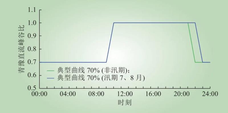 由圖5可知,青海電網(wǎng)光伏出力主要分布在10:00—16:00,河南電網(wǎng)用電高峰期(晚高峰)主要集中在17:30—21:30。根據(jù)青海電網(wǎng)以及西北其他省區(qū)發(fā)電特性和發(fā)電能力,結(jié)合河南電網(wǎng)(華中電網(wǎng))負(fù)荷特性,測定特高壓青豫直流典型運(yùn)行曲線,如圖6所示,高峰段時(shí)間為10:00—21:00(非汛期),10:00—22:00(汛期7月、8月),其他時(shí)段為低谷時(shí)段,青豫直流峰谷比為1∶0.7。