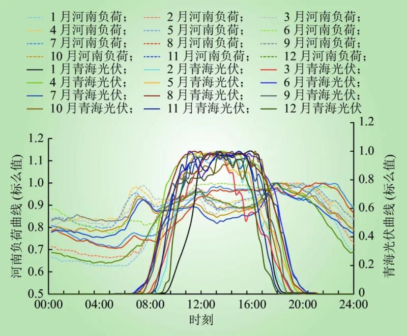 由于青海電網(wǎng)光伏裝機(jī)容量大、占比高,對(duì)青豫直流外送影響較大,本文重點(diǎn)選取光伏曲線進(jìn)行比對(duì)分析。青豫直流輸電典型曲線設(shè)置需兼顧送端青海以光伏為主的發(fā)電特性和受段河南電網(wǎng)負(fù)荷特性,根據(jù)青海電網(wǎng)光伏曲線和河南電網(wǎng)負(fù)荷曲線的歷史數(shù)據(jù),繪制青海-河南光伏-負(fù)荷匹配曲線,如圖5所示。青海光伏出力和河南電網(wǎng)負(fù)荷的量級(jí)差較大,因此選取標(biāo)么值進(jìn)行對(duì)比(光伏基準(zhǔn)值為月度最大出力、負(fù)荷基準(zhǔn)值為月度最大負(fù)荷)。