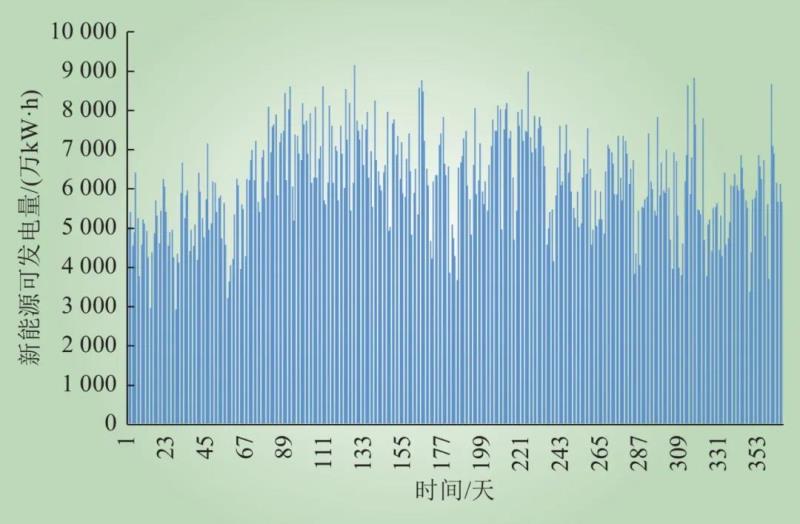 (2)波動(dòng)性(隨機(jī)性)。青海新能源發(fā)電波動(dòng)性較為明顯,如圖3所示,以年度為周期,典型年新能源日最大可發(fā)電量為9163萬kW?h,日均可發(fā)電量為6177萬kW?h,最小可發(fā)電量為2919萬kW?h,逐日、3天內(nèi)、一周內(nèi)新能源可用電量最大波動(dòng)幅度分別達(dá)到4982萬kW?h、4039萬kW?h和5073萬kW?h。全年相鄰日電量波動(dòng)超過1000萬kW?h的時(shí)間占40%,即全年40%的時(shí)間需要的調(diào)峰量相當(dāng)于4臺(tái)300 MW火電機(jī)啟停調(diào)峰接納新能源相鄰日的電量波動(dòng)[17-21]。因此,受風(fēng)電波動(dòng)性(隨機(jī)性)影響,青豫直流難以實(shí)現(xiàn)穩(wěn)定曲線外送。
