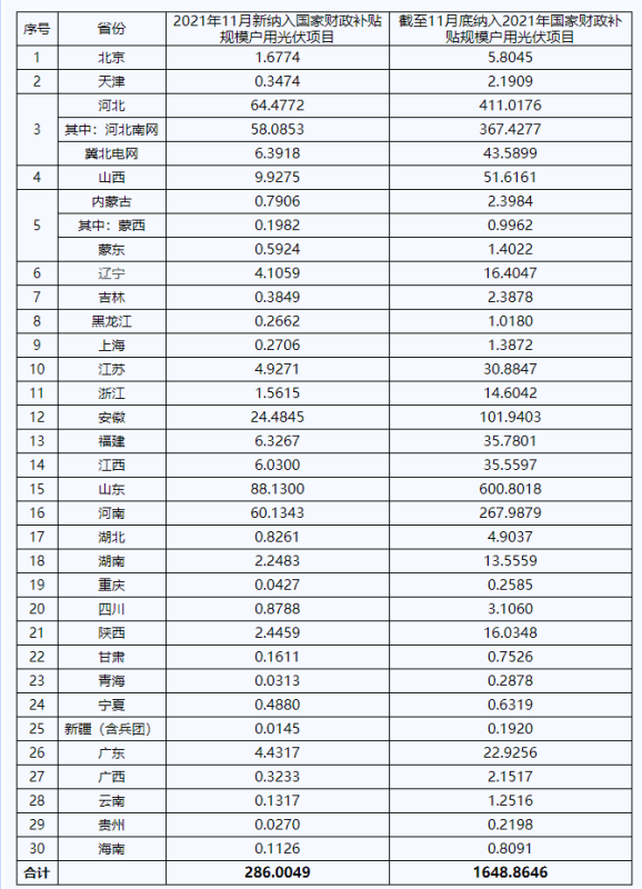 根據(jù)各省級(jí)能源主管部門、電網(wǎng)企業(yè)報(bào)送信息,經(jīng)國家可再生能源信息管理中心梳理統(tǒng)計(jì),2021年11月新納入國家財(cái)政補(bǔ)貼規(guī)模戶用光伏項(xiàng)目總裝機(jī)容量為286萬千瓦。截至2021年11月底,全國累計(jì)納入2021年國家財(cái)政補(bǔ)貼規(guī)模戶用光伏項(xiàng)目裝機(jī)容量為1648.86萬千瓦。詳細(xì)情況見附表。