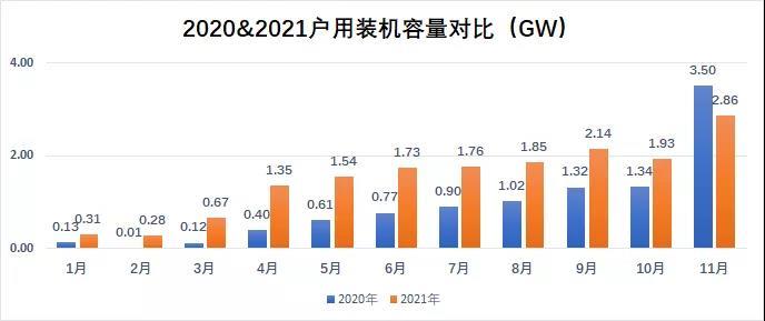 12月17日,國家能源局公布了2021年11月戶用光伏項(xiàng)目信息。截至2021年11月底,全國累計(jì)納入2021年國家財(cái)政補(bǔ)貼規(guī)模戶用光伏項(xiàng)目裝機(jī)容量為16.49 GW。2021年11月新納入國家財(cái)政補(bǔ)貼規(guī)模戶用光伏項(xiàng)目總裝機(jī)容量為2.86 GW,同比下降18.29%,環(huán)比增長48.19%。