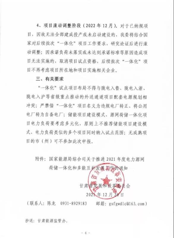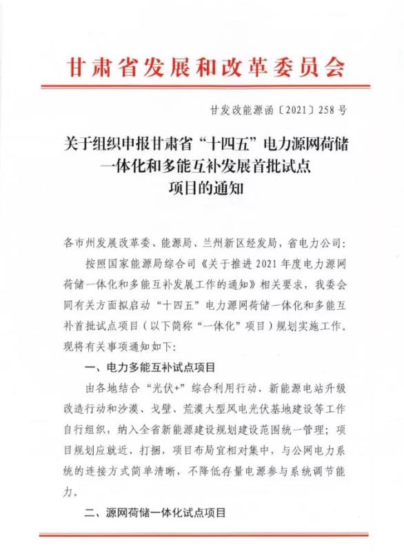 中國儲(chǔ)能網(wǎng)訊:12月20日,甘肅省發(fā)改委印發(fā)《關(guān)于組織申報(bào)“十四五”電力源網(wǎng)荷儲(chǔ)一體化和多功能互補(bǔ)發(fā)展首批試點(diǎn)項(xiàng)目的通知》,就項(xiàng)目申報(bào)有關(guān)事項(xiàng)給出具體指導(dǎo)。