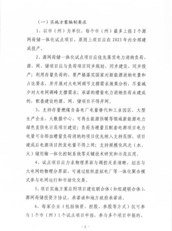 根據(jù)文件,電力多能互補(bǔ)試點(diǎn)由各地結(jié)合“光伏+”綜合利用行動(dòng)、新能源電站升級改造和沙漠、戈壁、荒漠大型風(fēng)電光伏基地建設(shè)等工作自行組織。源網(wǎng)荷儲(chǔ)項(xiàng)目則以市(州)為單位,每個(gè)市最多可申報(bào)2個(gè)項(xiàng)目,原則上應(yīng)在2023年內(nèi)全部建成投產(chǎn)。每家企業(yè)僅可參與1市1個(gè)試點(diǎn)項(xiàng)目申報(bào)。