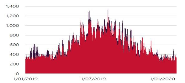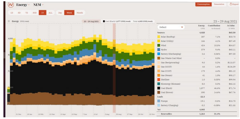 上圖是按發(fā)電類(lèi)型劃分的澳大利亞國(guó)家電力市場(chǎng)(NEM)每周的能耗,顯示澳大利亞冬季太陽(yáng)能發(fā)電量較低,而天然氣發(fā)電和燃煤發(fā)電量顯著增加。如果短期管理和儲(chǔ)能系統(tǒng)應(yīng)對(duì)需求高峰,每周需求是一個(gè)有用的指標(biāo)。除昆士蘭州外,澳大利亞其他州的冬季每周電力需求都高于夏季。
