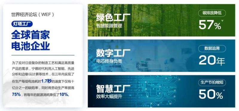 在極限制造方面,今年9月,寧德時代工廠被世界經(jīng)濟(jì)論壇評為全球“燈塔工廠”,成為全球首個獲此認(rèn)可的電池工廠。世界經(jīng)濟(jì)論壇給我們的評選語是,為應(yīng)對日益復(fù)雜的制造工藝,滿足高質(zhì)量產(chǎn)品需求。寧德時代利用人工智能先進(jìn)分析,邊緣計(jì)算和云計(jì)算等技術(shù),可以每1.7秒生產(chǎn)一個電池,缺陷率僅有十億分之一,同時將勞動生產(chǎn)率提高了75%,能源消耗降低了10%。