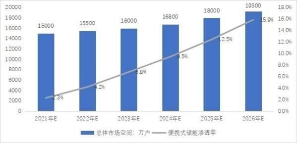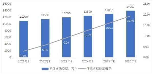 2021年,全球應(yīng)急領(lǐng)域需求的總體家庭數(shù)量約為11000萬戶,市場滲透率僅3%,預(yù)計到2026年,總數(shù)量將達(dá)到14000萬戶,按照便攜式儲能設(shè)備生命周期為3年計算,應(yīng)急領(lǐng)域市場滲透率可以達(dá)到19.4%。