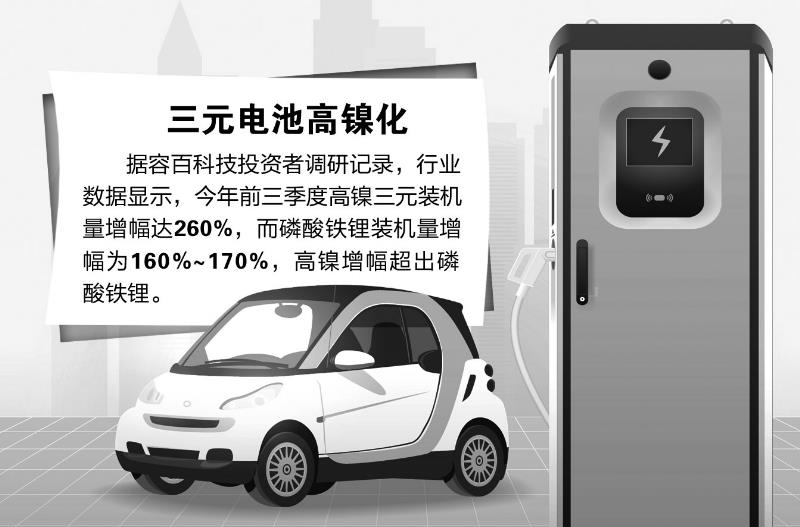此前,我國三元電池以NCM523為代表的5系中鎳為主,但近年來,高鎳在三元材料中的滲透率不斷提升。據(jù)鑫欏資訊數(shù)據(jù),今年7月國內(nèi)高鎳材料產(chǎn)量達(dá)到13820噸,占三元總產(chǎn)量的41.6%,首次超越主流5系材料,順利登頂。隨后幾個(gè)月,高鎳三元材料市占率一直維持高位,其中8系市占率穩(wěn)定在40%以上。據(jù)容百科技(688005)投資者調(diào)研記錄,行業(yè)數(shù)據(jù)顯示,今年前三季度高鎳三元裝機(jī)量增幅達(dá)260%,而磷酸鐵鋰裝機(jī)量增幅為160%~170%,高鎳增幅超出磷酸鐵鋰。當(dāng)升科技(300073)亦表示,公司高鎳8系產(chǎn)品在總銷量中的占比正在快速提升,主要出口海外和供應(yīng)給車企客戶。
