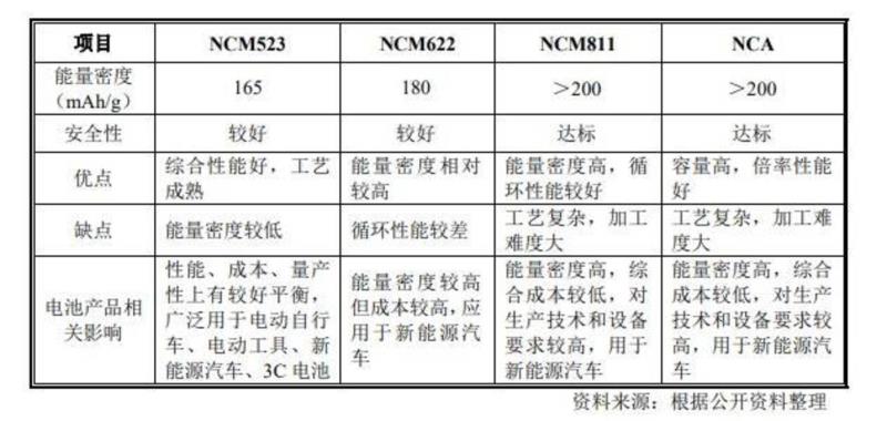 從目前公開資料來看,NCM811和NCA兩種含鈷較低的動力電池,能量密度提升顯著,但在安全余量上略低于NCM523和NCM622。