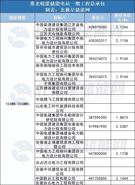 其中最高報價為中國電力工程顧問集團西北電力設計院有限公司的44780萬,儲能單價2.17元/Wh,最低報價為中國電建集團華東勘測設計研究院有限公司的38759.53萬,儲能單價1.88元/Wh、