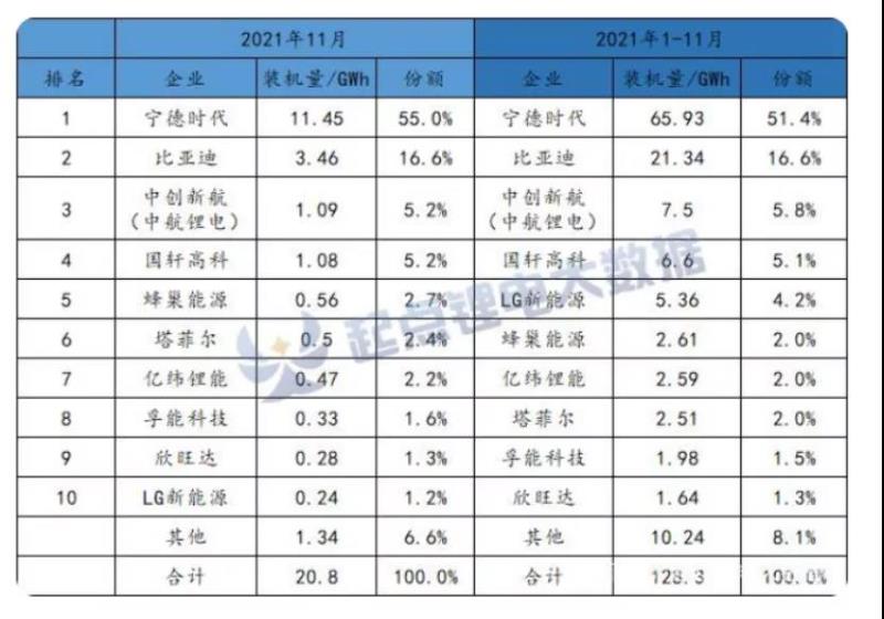 縱觀全年,1-11月累計裝機量達128.3GWh,同比累計上升153.1%。競爭格局仍舊是一超多強的局面。